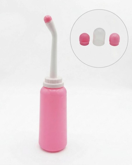 Tragbares Intim-Bidet (500 ml) für sanfte und hygienische Reinigung. Set enthält eine 17 cm hohe Flasche (Ø 7 cm), 1 Rohr, 2 Düsen und 1 Schutzkappe - ideal für die tägliche Intimhygiene zu Hause oder unterwegs.