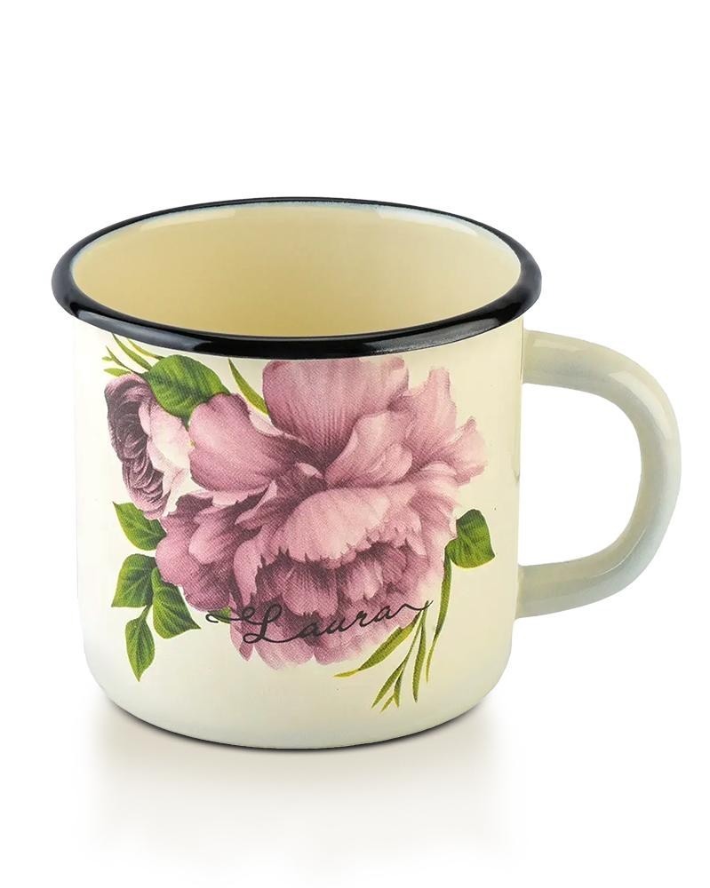 Die Emaille-Tasse IDILIA „Laura“ 0,4 l in Milchfarbe mit Dekor ist ein stilvolles, robustes und praktisches Geschirr für Tee, Kaffee und andere Getränke, das Funktionalität, Langlebigkeit und gemütliches Design vereint.