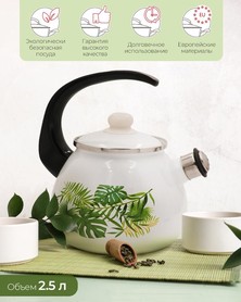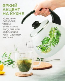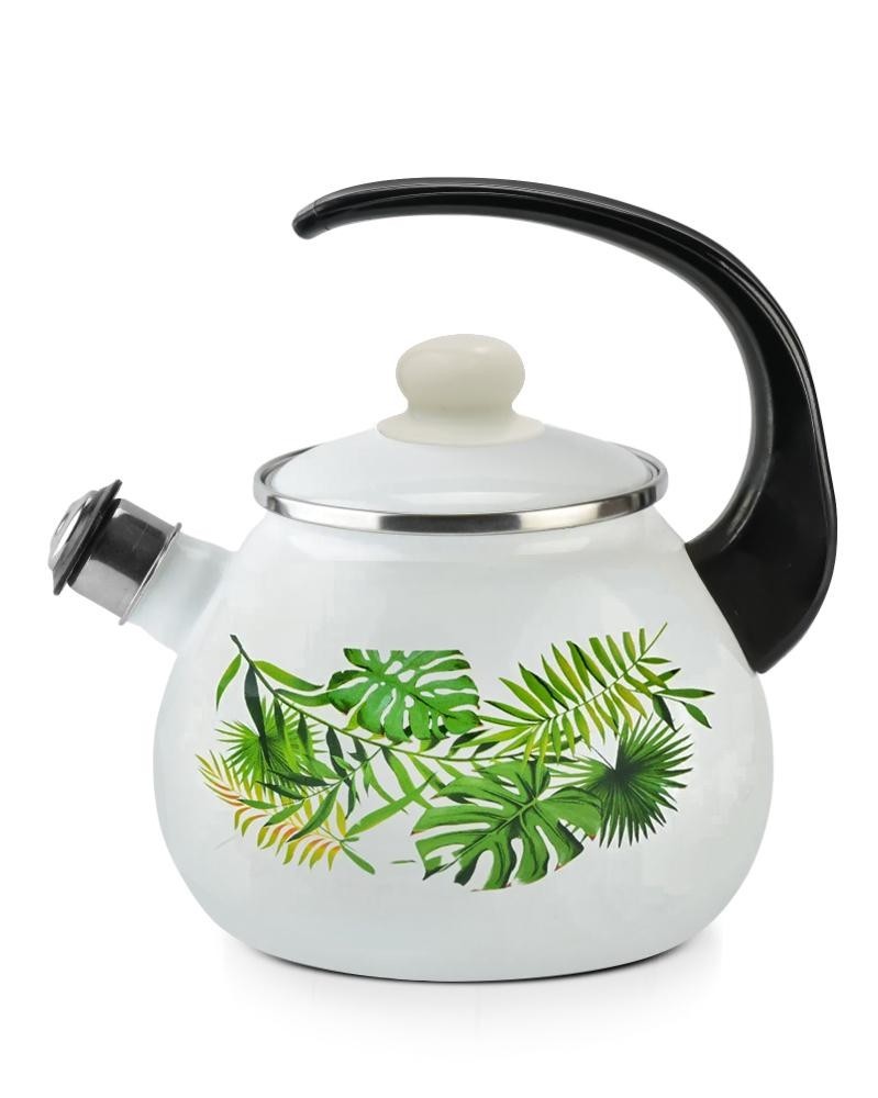 Der weiße Hintergrund und die dekorativen grünen Palmenblätter machen den Teekessel zu einem stilvollen Akzent in Ihrer Küche. Die Emaille bewahrt den reinen Geschmack des Wassers, ist widerstandsfähig gegen Beschädigungen und besonders pflegeleicht.