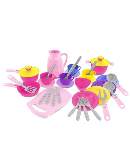 Ein Kinderküchenset, das nun immer und überall bei seinem kleinen Besitzer dabei sein kann. Das Spielzeuggeschirr ist in einer hellen Wellpappschachtel verpackt und kann vom Baby auf einen Spaziergang mitgenommen werden.