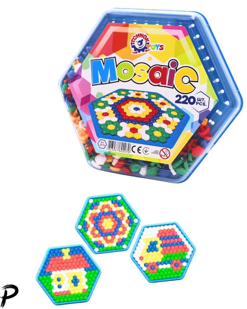 Das TECHNOK TOYS Mosaik mit 220 Teilen ist ein farbenfrohes Lernspiel, das die Feinmotorik, Hand-Augen-Koordination und Präzision der Kinder fördert. Die bunten Steine lassen sich leicht in die Grundplatte einsetzen, sodass Kinder einfache und komplexe Muster gestalten oder eigene Bilder erfinden können.