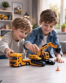 Inertiales Spielzeug-Set mit Bagger und Transporter für realistischen Spielspaß. Beweglicher Baggerarm sowie Gummi-Räder und Raupen sorgen für dynamisches Spielen.