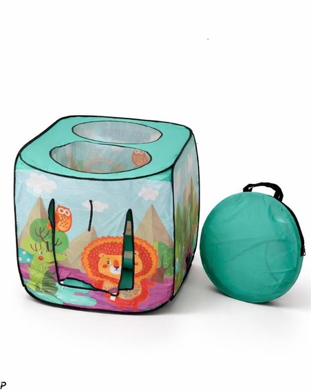 Faltbares Kinder-Spielzelt (Spielhaus) ist ein heller und gemütlicher Ort zum Spielen, der dem Kind seine eigene kleine Welt für Fantasie und Unterhaltung schenkt. Das Zelt ist mit bunten Motiven von Tieren und Natur verziert, was es besonders attraktiv für Kinder macht. Dank der durchdachten Konstruktion mit oberen Öffnungen von etwa 50 cm Durchmesser wird das Zelt gut belüftet und lässt natürliches Licht hinein, wodurch im Inneren eine angenehme Atmosphäre entsteht. Dieser Spielbereich eignet sich sowohl für aktive Spiele als auch für ruhige Momente - zum Ausruhen, Lesen oder Spielen mit Spielzeug.