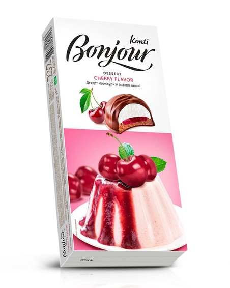 KONTI Bonjour „Kirsche“ - feines Dessert mit fruchtiger Kirschcreme und zarter Schokoladenglasur. Fruchtig, cremig und perfekt zum Kaffee oder als süße Auszeit.