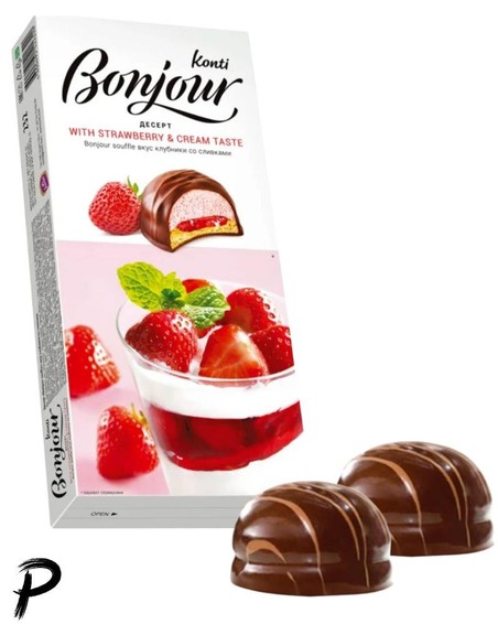 Bonjour von KONTI ist mehr als nur eine Süßigkeit - es ist ein echtes Geschmackserlebnis. Die Kombination aus fruchtiger Erdbeercreme, samtiger Sahne und zarter Schokolade macht jeden Bissen zu einem kleinen Fest für die Sinne.
