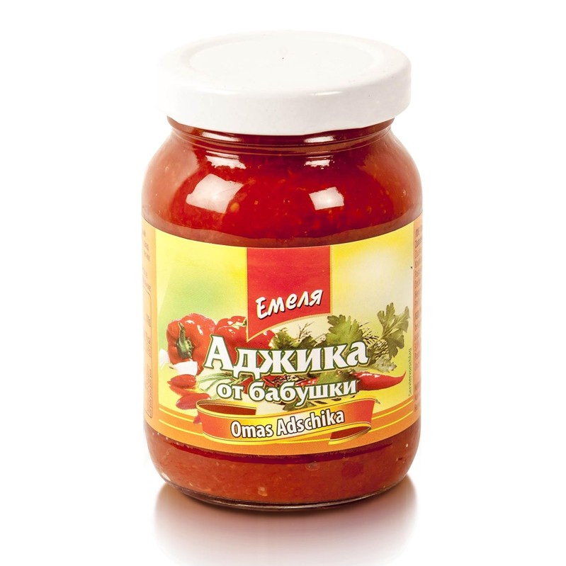 Scharfe Adschika mit einer traditionellen Rezeptur aus süßer und scharfer Paprika, Knoblauch, Karotten und Tomatenmark. Perfekt für Fleisch, Gemüse und Marinaden.