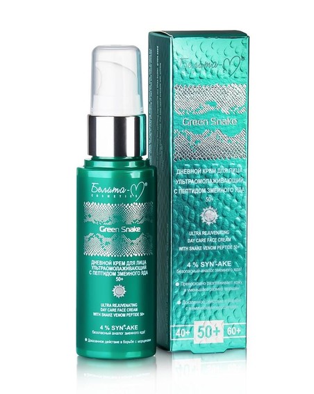 Anwendung: Tragen Sie die Creme mit leichten Klopfbewegungen auf die gereinigte Haut auf. In Bereichen, in denen Falten ausgeprägt sind: Krähenfüße, Nasolabialfalten, auf der Stirn, die Haut gründlich einmassieren, bis die Creme vollständig eingezogen ist. Vor dem Auftragen der Creme empfehlen wir die Verwendung eines aktiven Gesichtskonzentrats mit Schlangengiftpeptid und Kollagen zur Korrektur tiefer Falten 50+. Die Creme ist für den Hals- und Dekolletébereich geeignet. Für maximale Wirkung in Kombination mit der ultra-verjüngenden Nachtgesichtscreme mit Schlangengiftpeptid 50+ verwenden.