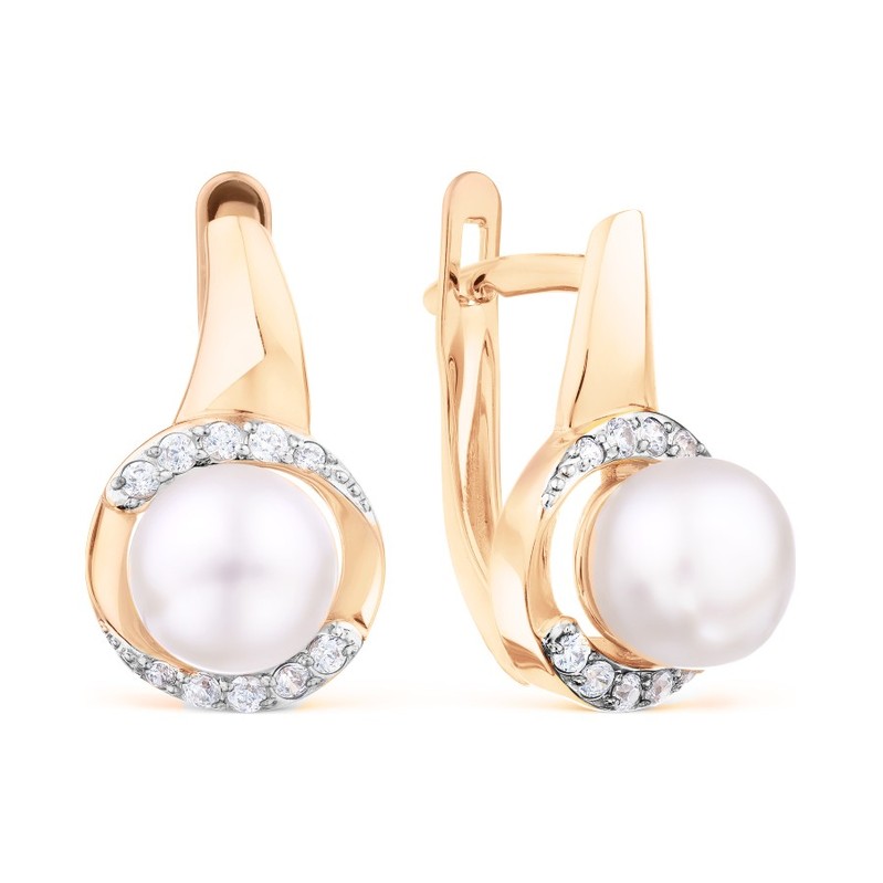 Exquisite Ohrhänger, Russisches Rotgold 585, mit 20 Zirkonia und 2 Perlen - Größe ca. 6,5-7 mm, Breite ca. 10 mm, Höhe ca. 17 mm