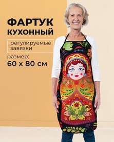 Dunkle Küchenschürze „Matrjoschka“ mit einer großen Matroschka auf dem Vorderteil. Maße: 80 cm Länge, 60 cm Brustbreite, Bindebänder je 61 cm - praktisch und dekorativ.