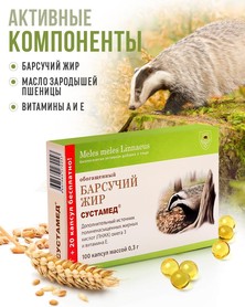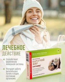 Барсучий жир в капсулах способствует укреплению иммунной системы, улучшению работы дыхательных путей и общего состояния организма, не содержит искусственных добавок и консервантов.