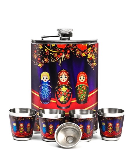 Все элементы украшены ярким рисунком с изображением традиционных русских матрёшек в хохломском стиле. Компактный и эффектный, набор упакован в подарочную коробку с красной бархатной подложкой, что делает его готовым решением для презента.