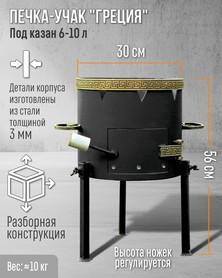 Печь-учак для казана «Греция» Ø30 см - это надёжное решение для приготовления блюд на открытом огне. Идеально подходит для казанов объёмом 6-10 литров и станет отличным выбором для дачи, пикников, кемпинга и отдыха на природе.