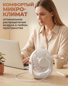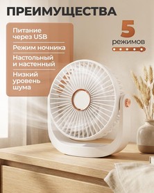 USB настольный и настенный вентилятор с 5 режимами и ночником обеспечивает комфортную циркуляцию воздуха дома, в офисе или спальне. Компактный (16 x 17 см), экономичный (4.5 W) и выполнен из прочного ABS + PP.