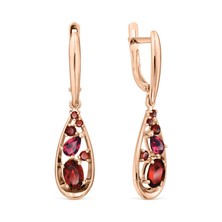 Изысканные серьги из красного золота 585 пробы выполнены в вытянутой каплевидной форме и украшены вставками из родолита и граната.