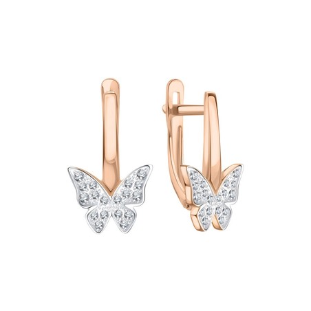 Красивые серьги в форме бабочек из русского красного золота 585 пробы, с вставками по 18 фианитов на каждой, английский замок, высота ≈ 19 мм.
