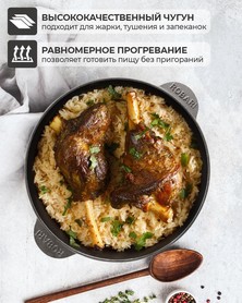 - Высококачественный чугун, обладает исключительной прочностью и долговечностью, отлично подходит для жарки, тушения и запеканок.