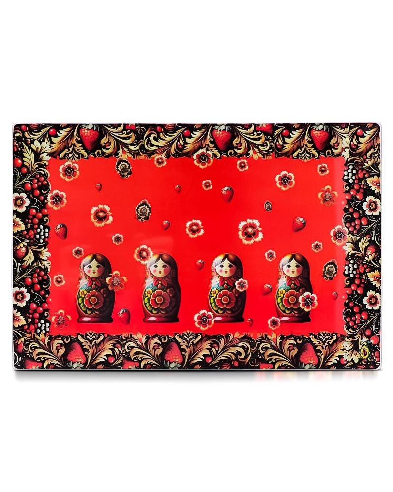 Стеклянная доска-подставка "Матрёшки красные" — стильный и практичный аксессуар, станет ярким и функциональным акцентом на вашей кухне.