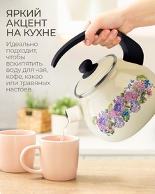 Эмаль на стенках и дне чайника защищает от коррозии, не впитывает запахи и сохраняет чистый вкус воды. Нержавеющий ободок повышает прочность и защищает края от сколов, обеспечивая долгий срок службы. Деколь «Анабель» в молочном цвете с нежным цветочным узором придаёт посуде изысканный, утончённый вид и станет украшением вашей кухни.