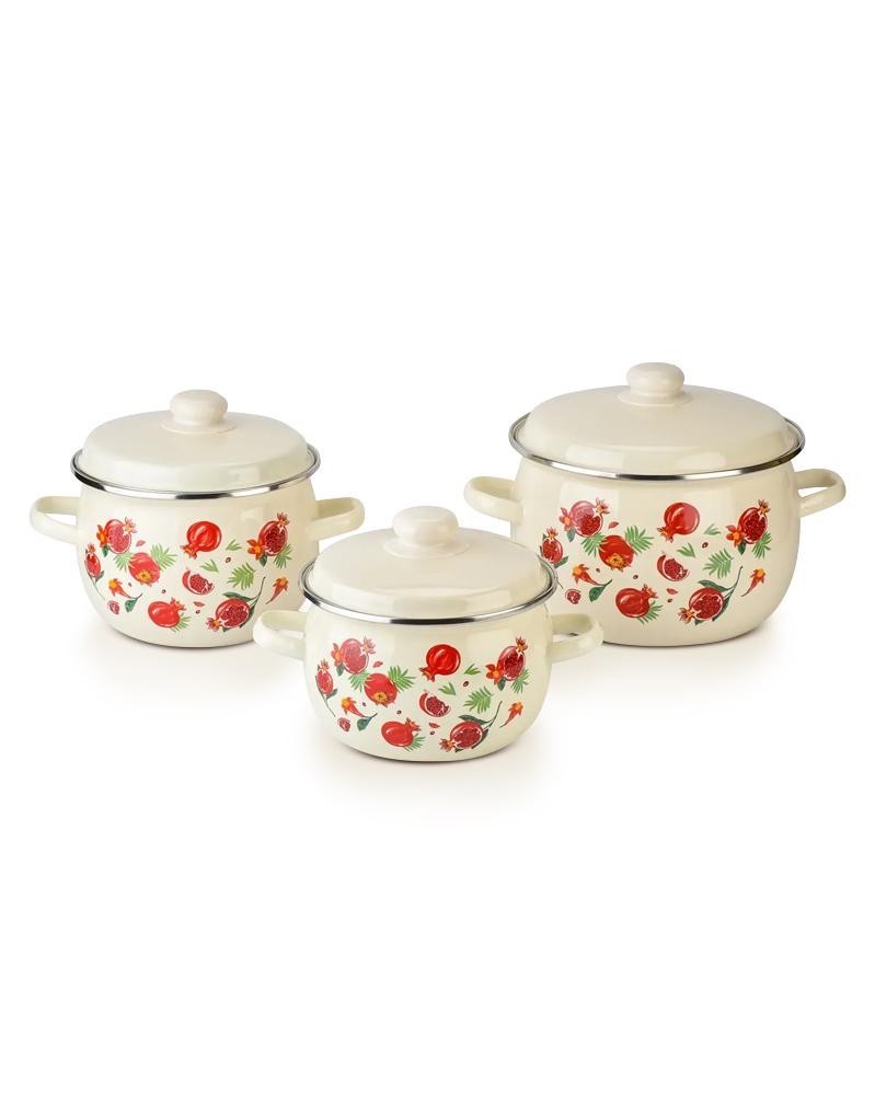 В набор входят 3 сферические кастрюли с крышками объёмом 2,5 л, 3,5 л и 5 л, выполненные из прочной эмалированной стали. Металлическая фурнитура гарантирует надёжность и удобство в использовании, а яркая деколь «Гранат» придаёт изделиям изысканный вид.