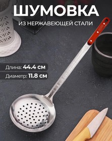 Шумовка из нержавеющей стали 44 см с деревянной вставкой на ручке. Подходит для извлечения овощей, картофеля фри, голубцов и других блюд из кипящей воды или масла. Прочный, удобный и долговечный кухонный аксессуар.