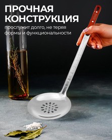 Шумовка подходит как для домашнего, так и для дачного использования. Ее прочная конструкция и долговечность гарантируют, что она будет служить долго, не теряя формы и функциональности. Изготовленная из высококачественной нержавеющей стали, шумовка устойчива к деформации, не выделяет вредных веществ и не окисляется при контакте с продуктами, что делает ее идеальным инструментом для приготовления пищи, в том числе для таких блюд как плов.