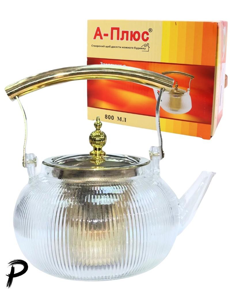 Заварник A-PLUS из боросиликатного стекла и металла (800 мл) - прочный и стильный чайник, устойчивый к высоким температурам. Идеален для заваривания чая, трав и кофе.