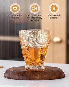 В набор входит 4 массивных стакана, выполненных из толстого, прочного стекла. Они приятно лежат в руке и устойчивы на поверхности, а рельефные узоры красиво преломляют свет, создавая эффектные блики. Эти стаканы подходят для подачи воды, сока, лимонада или коктейлей и идеально впишутся как в повседневный, так и в праздничный сервиз.