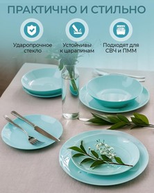 Вся посуда выполнена из ударопрочного закалённого стекла, устойчивого к перепадам температур, ударам и ежедневной эксплуатации. Стекло не впитывает запахи, быстро моется и сохраняет первоначальный внешний вид даже спустя годы. Благодаря гладкой поверхности блюда выглядят эстетично, а использование сервиза становится особенно приятным.