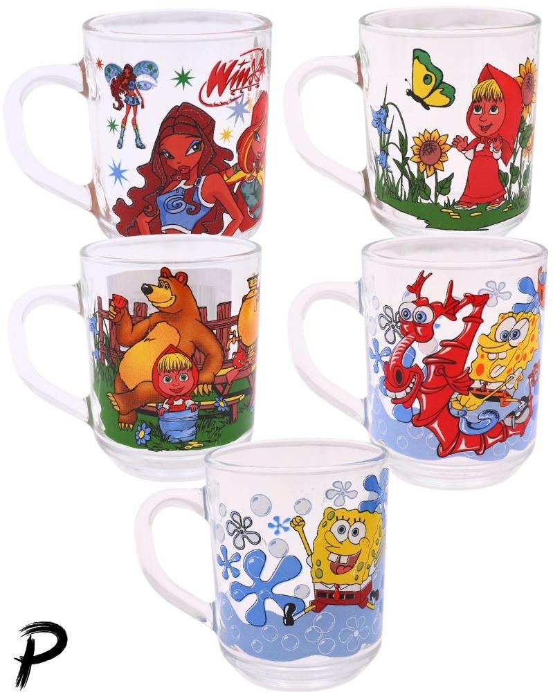 Стеклянная детская чашка «Cartoon-Mix», 200 мл - с изображениями любимых мультгероев (Маша и Медведь, Спанч Боб, Винкс и др.). Цвет и рисунок выбираются случайно. Не рекомендуется мыть в посудомоечной машине.
