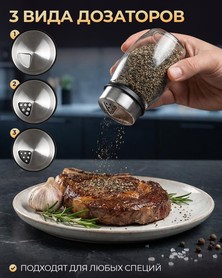Баночки оригинальной формы изготовлены из прочных материалов - стекла и пластика, а крышки плотно и надёжно закрываются, сохраняя аромат и свойства специй. В крышках предусмотрены отверстия разного размера, позволяющие как высыпать большее количество приправ, так и слегка приправить блюдо, а при необходимости полностью закрыть отверстия от случайного просыпания.