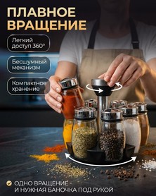 Вращающаяся карусель для специй с 6 ёмкостями помогает удобно хранить приправы, соль и сахар, экономя место на кухне. Современный дизайн и плотно закрывающиеся баночки обеспечивают порядок и сохраняют аромат специй.