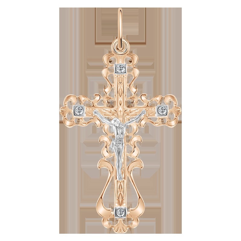 Изысканная подвеска - крест из красного и белого золота 585 пробы, с вставкой из 4 фианитов, с гравировкой на оборотной стороне "Спаси и сохрани", высота ≈ 45 мм. Восхитительная тонкая работа выполненная из комбинированного золота притягивает взгляд. Красивое ажурное обрамление креста в сочетании с блестящими камнями придают украшению роскошный вид. Сама композиция золотого крестика была создана в изящном и очень красивом стиле ренессанс. Нательный крест – знак любви и веры к Богу, надежды на Его помощь и милость. Его можно сравнить с обручальным кольцом: как кольца указывают на связь между любящими друг друга людьми, так и крестик есть выражение неразрывной связи с Богом.