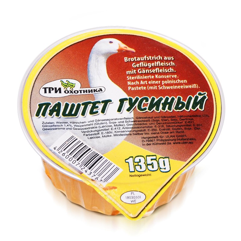 Гусиный паштет ТРИ ОХОТНИКА - нежный и сытный деликатес с насыщенным вкусом, идеально подходящий для бутербродов и закусок. Отличный выбор для повседневного и праздничного стола.