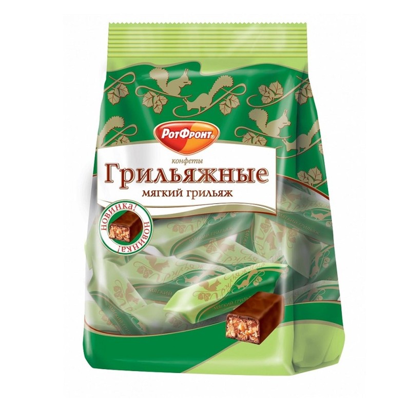 Шоколадные конфеты «Мягкий грильяж» от фабрики РОТФРОНТ– классический грильяж из дробленого арахиса, покрытый шоколадной глазурью. За счет большого количества фруктового повидла, добавленного в карамель, грильяж получается мягким, вязким, его легко раскусить, не дожидаясь, пока карамель растает, и наслаждаться ореховым хрустом. А в сочетании с горячим чаем грильяжные конфеты размягчаются еще быстрее, раскрывая все грани орехово-карамельного вкуса и аромата с яркими шоколадными оттенками.