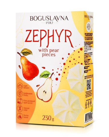 Зефир BOGUSLAVNA с кусочками груши - это утонченное лакомство, в котором нежная воздушная текстура зефира сочетается с фруктовым вкусом. Каждая порция словно тает во рту, оставляя легкий грушевый шлейф и приятное послевкусие.