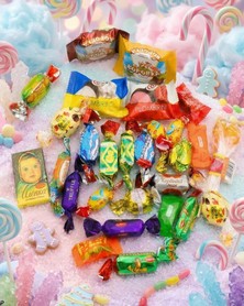 Внутри представлены самые разные конфеты - от нежных ирисок и фруктовых карамелек до воздушного суфле и глазированных сладостей. Такое разнообразие позволяет наслаждаться множеством текстур и вкусов, превращая каждую конфету в маленький сладкий сюрприз.