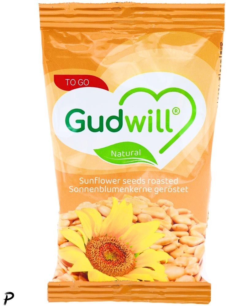 Очищенные и обжаренные семена подсолнечника GUDWILL без добавления соли. Натуральный хрустящий продукт в удобной упаковке 100 г.