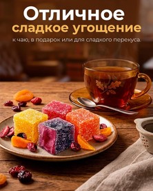 Благодаря тщательно подобранному составу мармелад обладает ярким ароматом, сбалансированной сладостью и аппетитным внешним видом. Он отлично подойдёт к чаю или кофе, станет приятным перекусом в течение дня и порадует как взрослых, так и детей. Удобная упаковка делает продукт практичным для дома, офиса или в дороге.