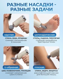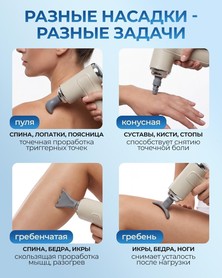 Идеально подходит для расслабления мышц в любом месте. Высокочастотная вибрация эффективно воздействует на глубокие мышцы. Сменные головки для точечной проработки различных зон тела.