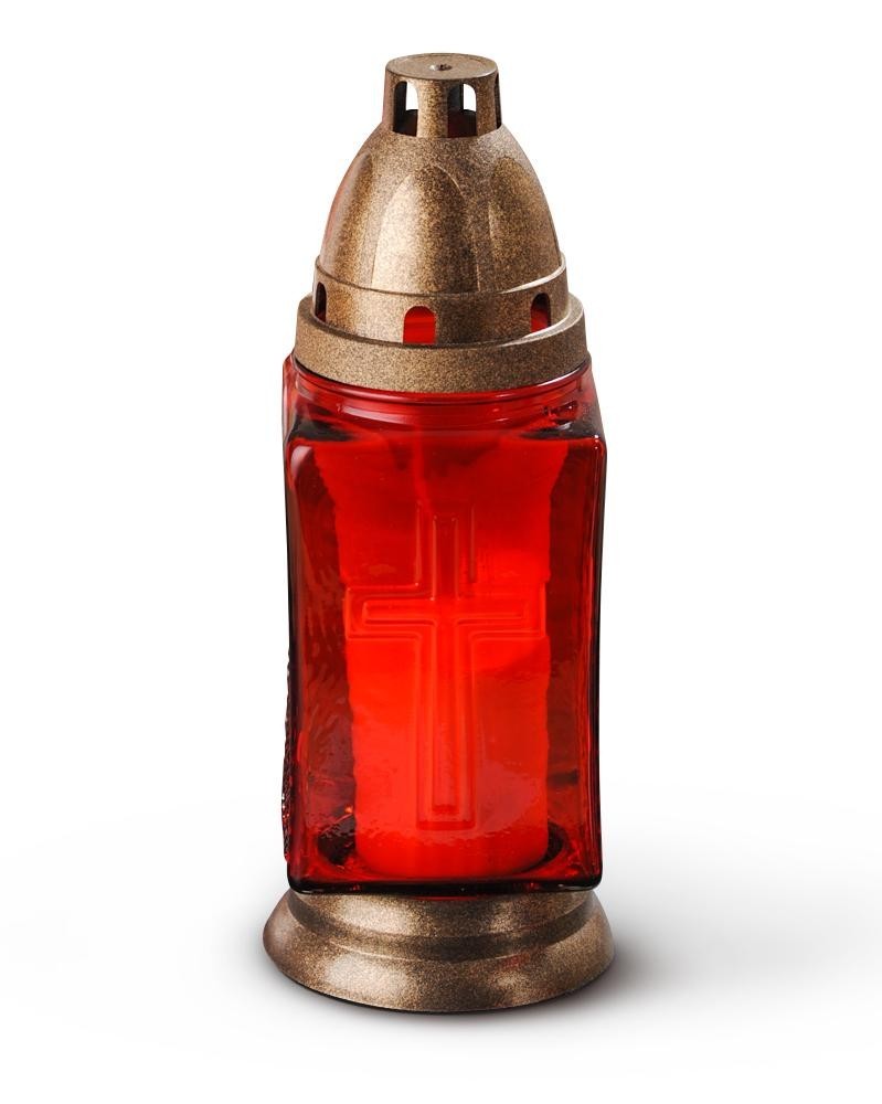 Поминальная лампада из толстого цветного стекла, с пластмассовым колпачком. Внутри парафиновый вкладыш с длинным фитилём. Общая высота лампады около 24-26 сантиметров. После применения и выгорания вкладыша, возможно повторное применение, если вставить новый парафиновый вкладыш.