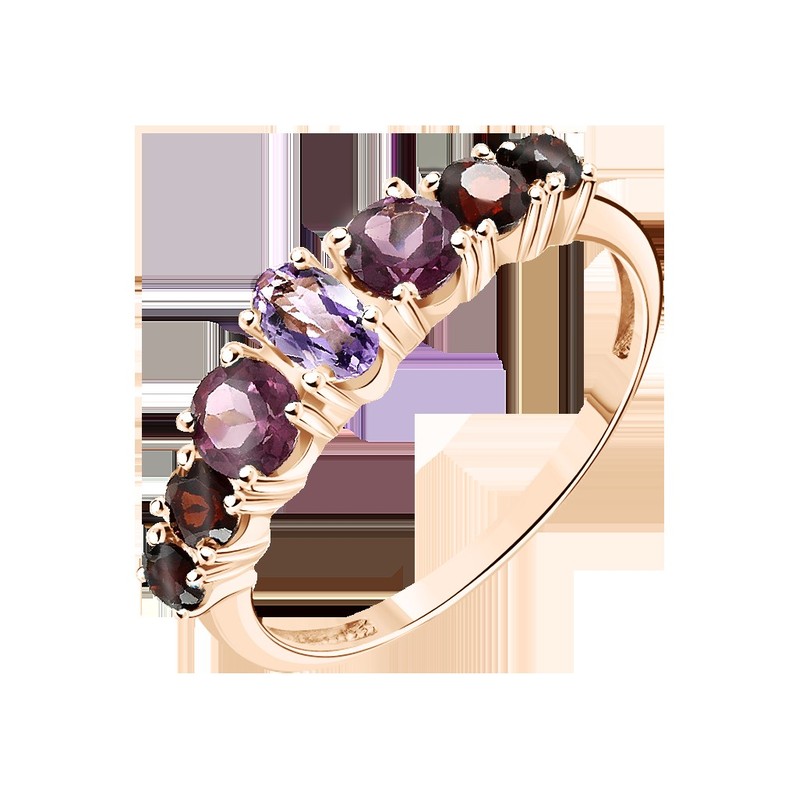 Очаровательное женское кольцо из русского красного золота 585 пробы, с вставками из 4 гранатов, 2 родолитов и 1 аметистом размером ≈ 5x3 мм.