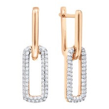 Изысканные серьги из русского красного золота 585 пробы, с вставками по 59 фианитов на каждой, английский замок, ширина ≈ 9 мм, высота ≈ 33 мм.