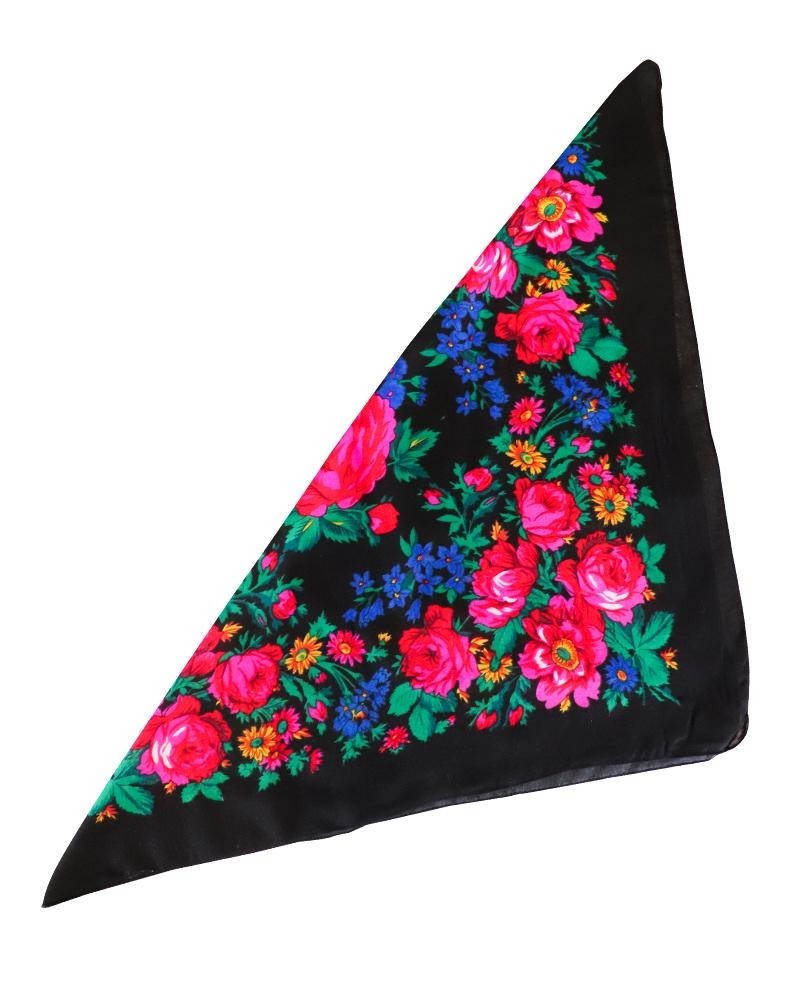 Черный фон с яркими цветами создаёт выразительный контраст, придавая платку динамичность и живость.